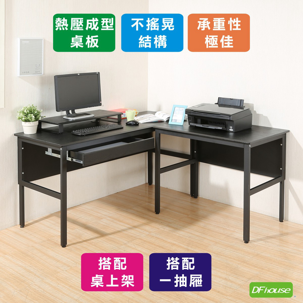 《DFhouse》頂楓150+90公分大L型工作桌+1抽屜+桌上架-黑橡木色
