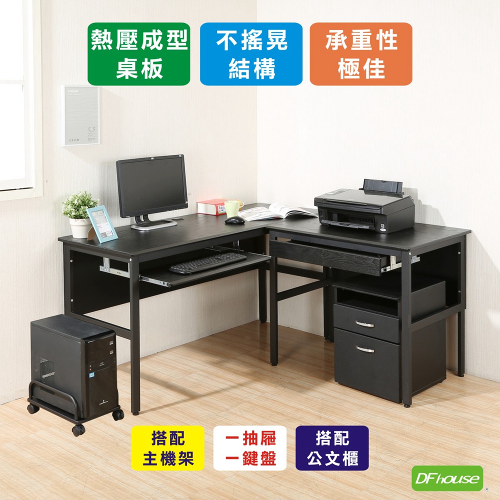《DFhouse》頂楓150+90公分大L型工作桌+1抽屜1鍵盤+主機架+活動櫃-胡桃色